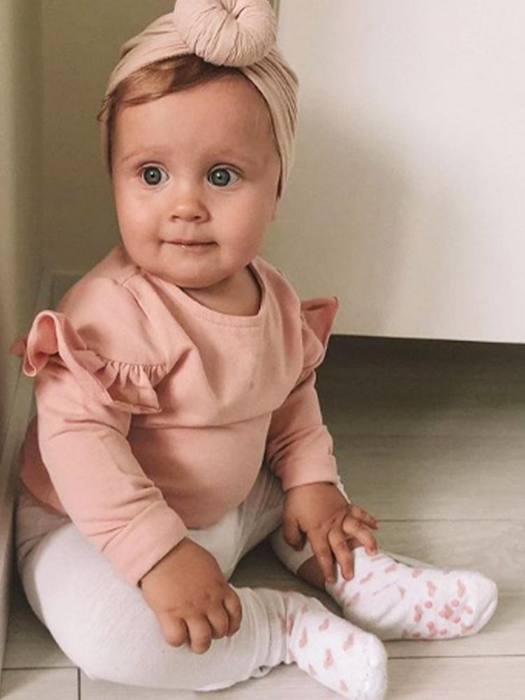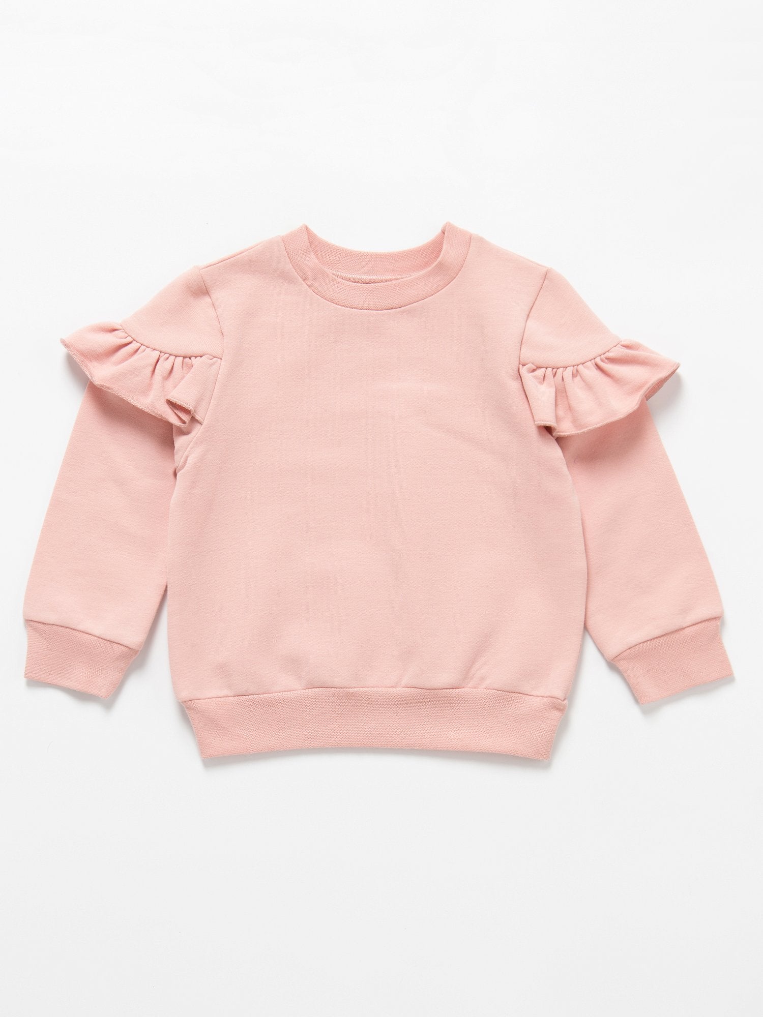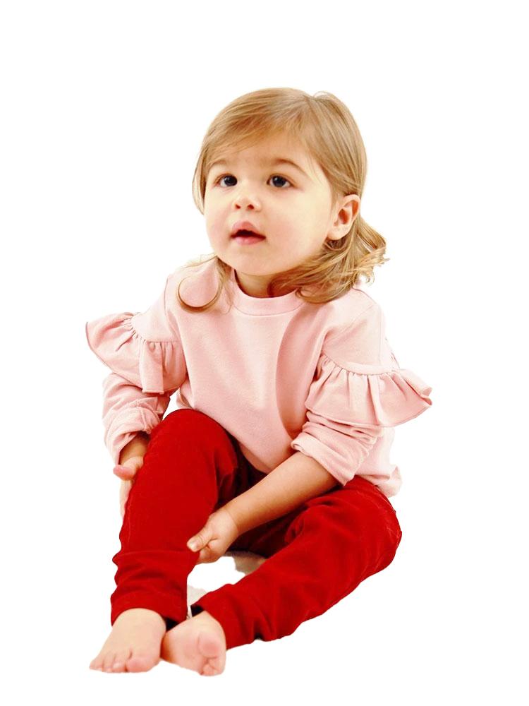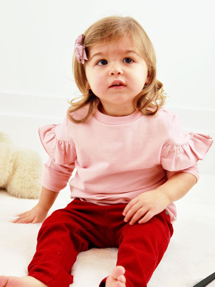 Blusa de manga larga de color rosa con volantes.